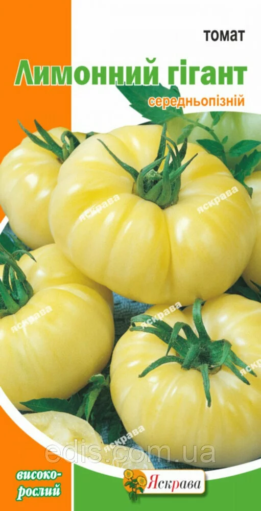 Томат Лимонний гігант 0,1 гСреднепоздний крупноплодный сорт. Вегетационный период от всходов до начала плодоношения 120-130 дней. Куст сильнорослый, высотой 150-200 см. Плод плоско округлой формы, большой, мясистый, плотный, многокамерный, лимонно-желтого цвета, массой 250-500 г, отличных вкусовых качеств. Рекомендуется для выращивания в открытом гунте и пленочных укрытиях. Используют для потребления в свежем виде. Посев на рассаду в конце марта-начале апреля. Пикировка - в фазе первого настоящего листа. Высадка - в начале-середине мая (если апрель теплый, то высадка рассады возможна в конце апреля). Формують в одне стебло, видаляючи всі «пасинки». При утворенні п'ятого суцвіття починають видаляти нижні листки по 2-3 на тиждень. Схема посадки 40*60.