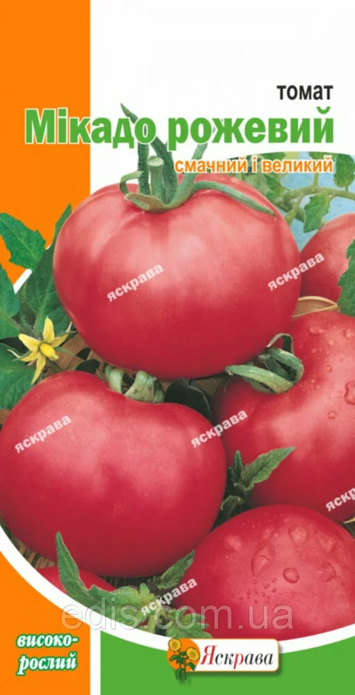 Томат Мікадо рожевий 0,1 гСередньостиглий сорт. Вегетаційний період від сходів до початку плодоношення 130-140 днів. Кущ високорослий, висотою 150-250 см. Плід плоско, великий, м'ясистий, щільний, рожевого кольору, масою 300-600 г, відмінних смакових якостей. Плоди довго зберігаються. Використовуються для споживання у свіжому вигляді.
