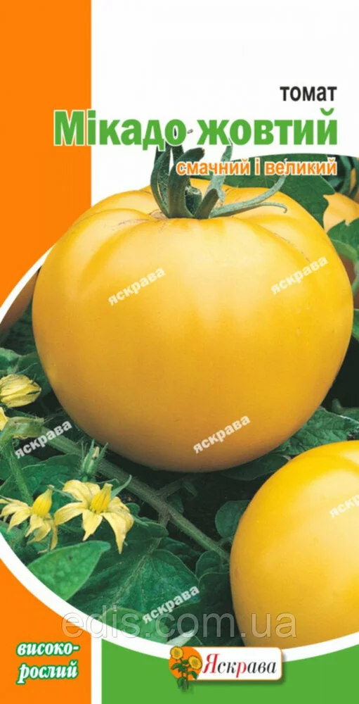 Томат Мікадо жовтий 0,1 гСередньостиглий сорт. Вегетаційний період від сходів до початку плодоношення 100-110 днів. Кущ високорослий, висотою 150-250 см. Плід плоско, великий, м'ясистий, щільний, жовтого кольору, масою 300-600 г, відмінних смакових якостей. Плоди довго зберігаються. Використовуються для споживання у свіжому вигляді.