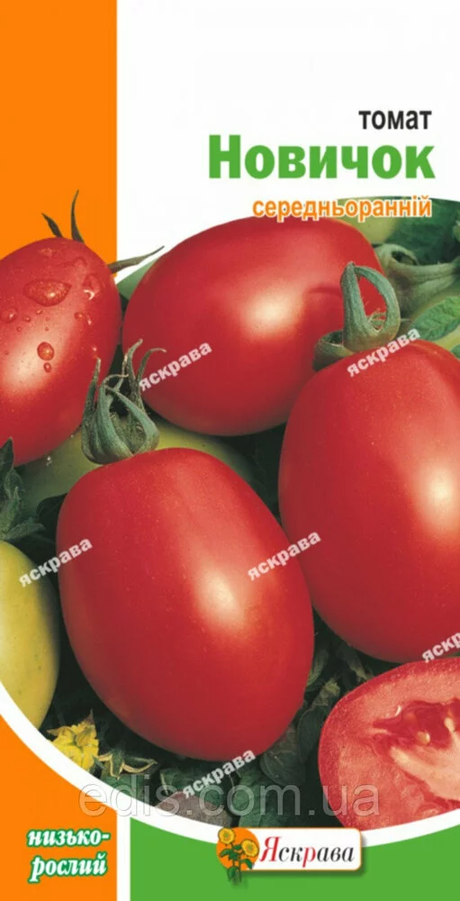 Томат Новачок 0,2 гСорт середньоранній, універсального використання. Від сходів до початку збирання 113-115 днів. Плодоношення триває 50-65 днів. Рослини висотою 50-85 см. Плоди масою 70-100 г овальні, подовжено-овальні, оранжево-червоного кольору, з хорошими смаковими якостями. Тепло, світлолюбна культура. Вирощують розсадним або безрозсадним способом. Норма висіву насіння в парник з пікіровкою 6-8 г, без пікіровки 3-4 г на 1 м(2). Розсаду висаджують у першій-другій декаді травня. У відкритий гунт насіння висівають при t + 13-15 C з нормою 5-6 штук на 1 пог.м. Глибина загортання 1,5-2 см. Ширина міжрядь 70 див
