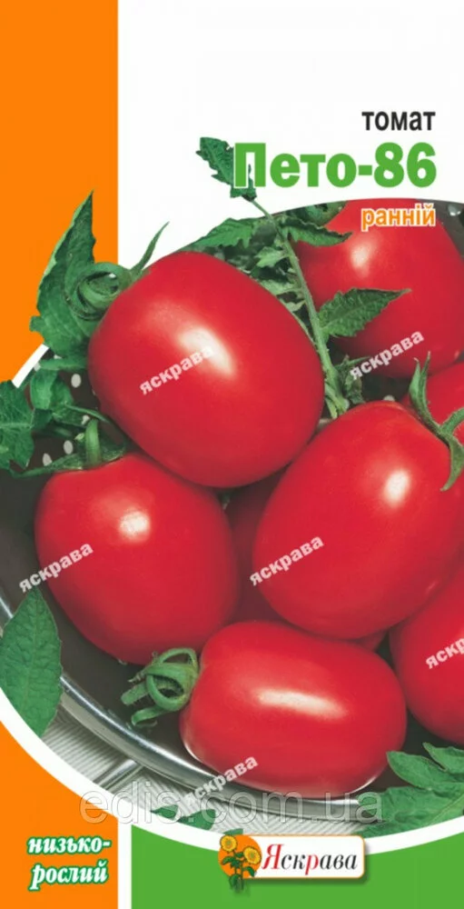 Томат Пето-86 0,2 гРанній детермінантний урожайний сорт голландської селекції. Визріває через 107 днів після посіву в грунт. Плоди сливоподібні-округлі, щільні, масою 100 г, хороше транспортування, високі смакові якості. Рекомендується для вирощування безпосередньо у відкритому гунте.
