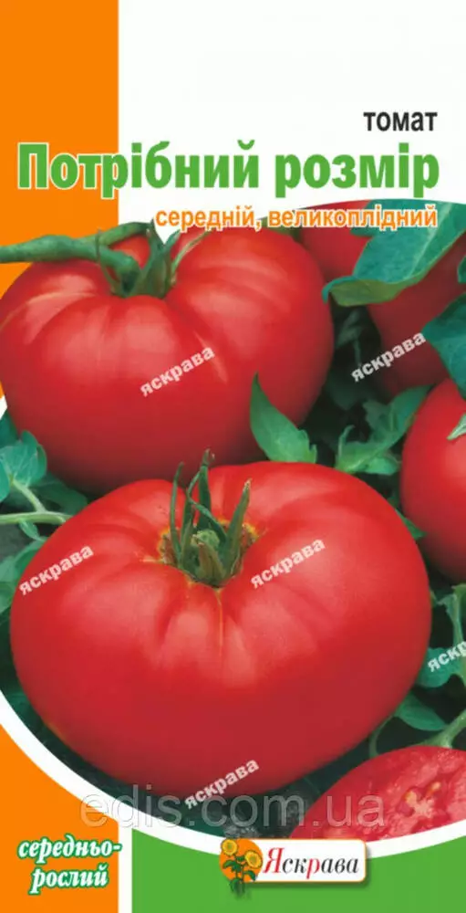 Томат Потрібний розмір 0,1 гСередньостиглий сорт. Вегетаційний період від початку сходів до початку плодоношення - 110-120 днів. Кущ середньо рослий, заввишки 80-100 см. Плоди плоско-округлої форми, ребристі, червоного кольору, м'ясисті, масою 200-500 м, відмінного смаку. Сорт цінується за високі смакові якості. Плоди використовують для споживання у свіжому вигляді і для переробки.