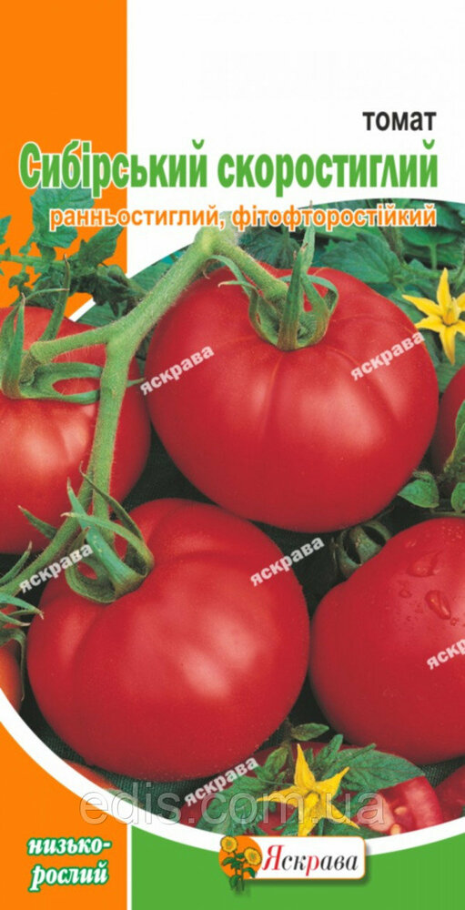 Томат Сибірський скоростиглий 0,1 гСередньоранній сорт. Тривалість вегетаційного періоду 90-100 днів. Рослина висотою 50-70 см. Плоди вирівняні, округло-плоскі, гладкі, середньою масою 60-100 г Придатні для споживання свіжими і для консервування. Смакові якості високі. Сорт відносно стійкий до фітофторозу.