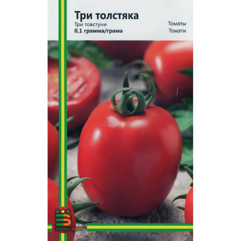 Томат Три товстуни - це середньостиглий і великоплідний сорт. Період від сходу до дозрівання 110-115 днів. Рослини високоросла (індетермінантна), висотою від 1,1 до 1,5 метра. Помідори цього виду мають форму сплюсненого серця. Кінчик у них втиснутий у м'якоть. Плід пофарбований у червоний колір, шкірка гладка, м'якоть смачна та м'ясиста. На кущі формуються кисті з 2-3 (до 4-5) плодами розміром досить великою. Маса екземплярів, що виросли, може досягати 700—800 г. Плоди добре протистоять розтріскуванню. Томат довго зберігається, може бути транспортований на великі відстані. Використовують його для створення різних салатів та складних консервованих асорті. Застосовується цей томат для отримання томатної пасти, соку, кетчупу.