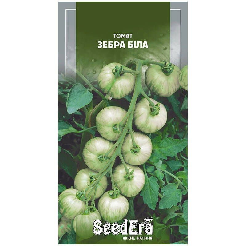 Томат Зебра біла - це високоврожайний середньостиглий сорт. Кущ потужний, висотою 1,5 м. Плоди округлої форми, білі в зелену смужку – на початку дозрівання, і трохи жовтуваті – у повній стиглості, вагою 50-100г, смачні і надзвичайно красиві.