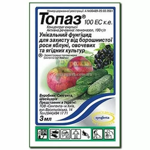 Топаз 100 ЕС к.е. — спеціальний високоселективний фунгіцид проти борошнистої роси, який має сильну лікувальну (3 доби) та профілактичну (7-8 діб) дію, що забезпечує надійний захист культур від борошнистої роси.