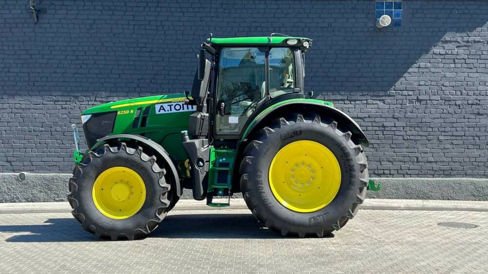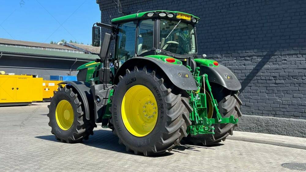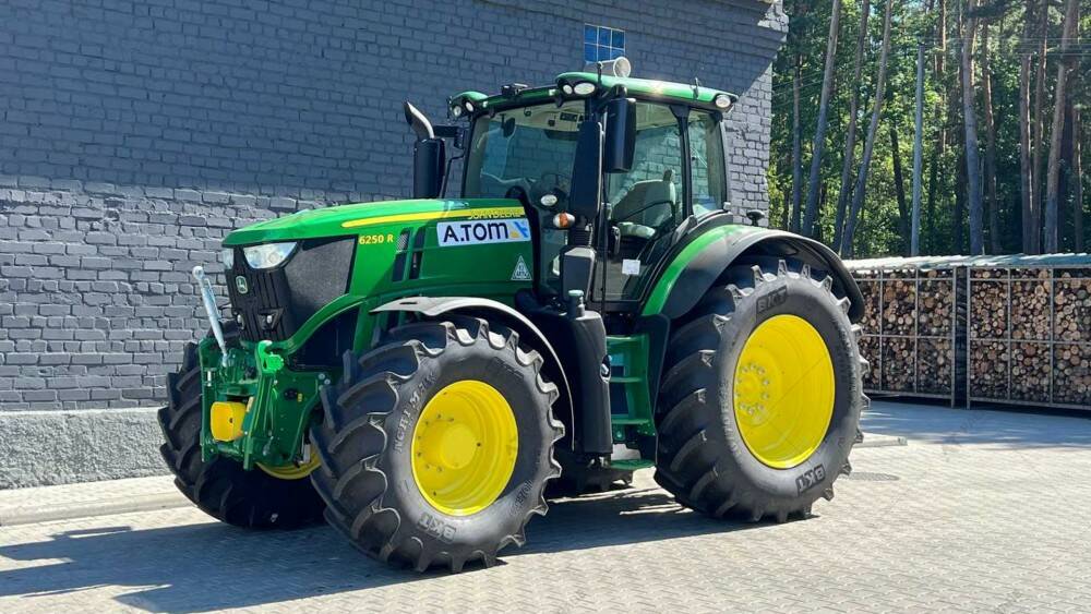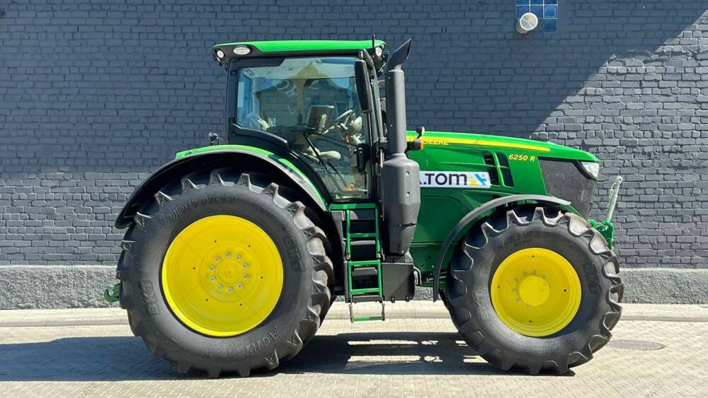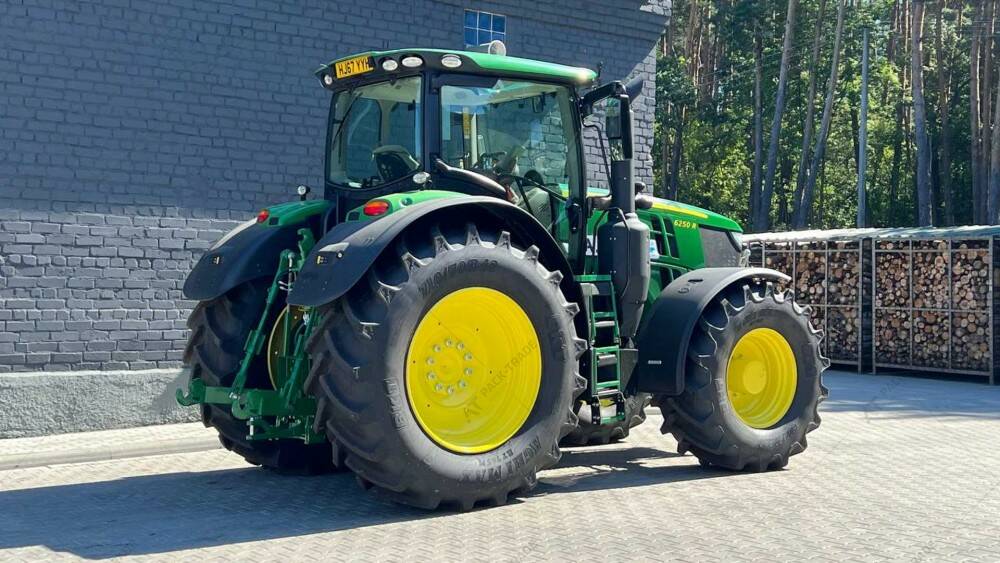 Дизельний трактор б/в John Deere 6250R, 2017 р/в, з напрацюванням 5130 м/год. Потужність двигуна – 250 к.с. Нова гума,зад. 710х70х42, пер. 600х70х30. Power Auto, круїз контроль, передня та задня навіска, клімат-контроль, Adblue, магнітола, холодильник. Компресор повітря, пневматичні та гідравлічні гальма.