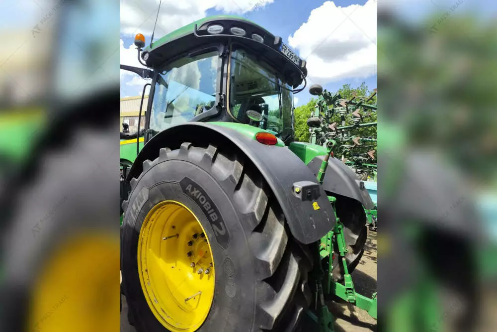 Дизельний трактор б/в JOHN DEERE 8320R, 2020 р/в, з напрацюванням 4910 м/год. Потужність двигуна – 320 к.с. КПП – AutoPower, розетка ISOBUS, гідравлічні гальма, джойстик ISOBUS, електричне регулювання дзеркал, 4 пари гідровиходів SCV ззаду, 1 пара гідровиходів спереду, передня навіска, клімат-контроль, передній міст ILS, ВВП 1000-1000E, двірник і шторка спереду, ззаду та праворуч, шини передні 600/70R30, шини задні 650/85R38, активації – автотрак та документування.