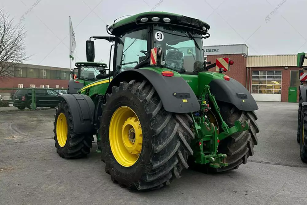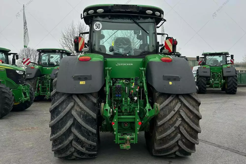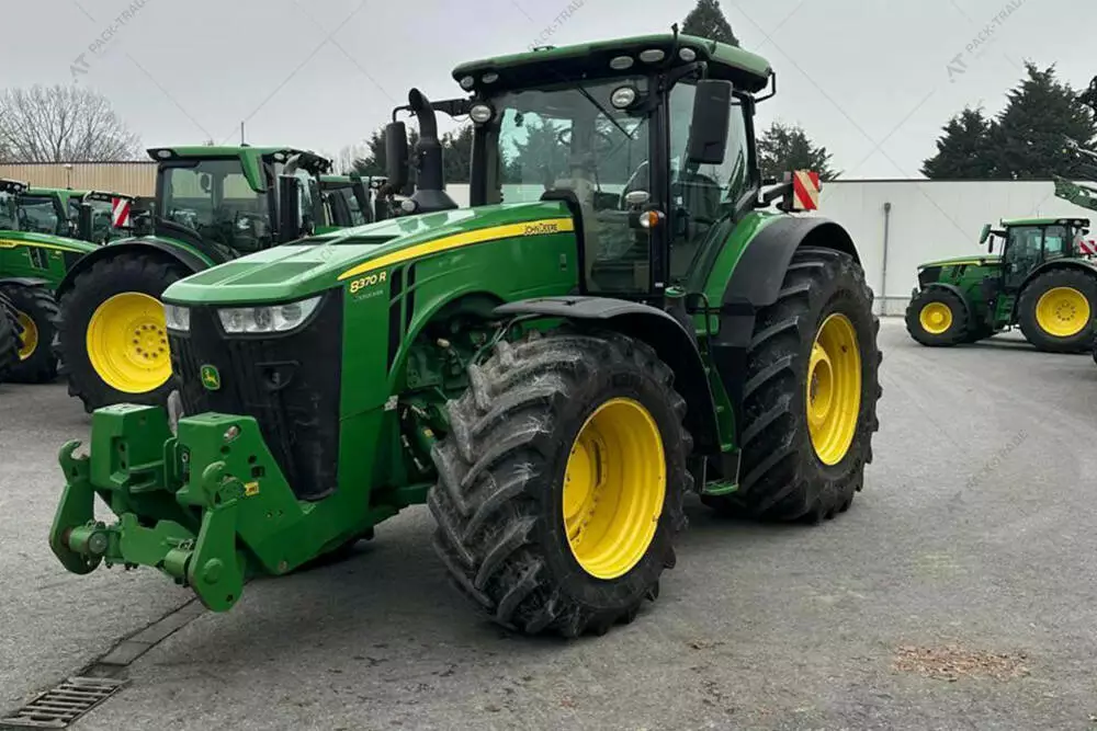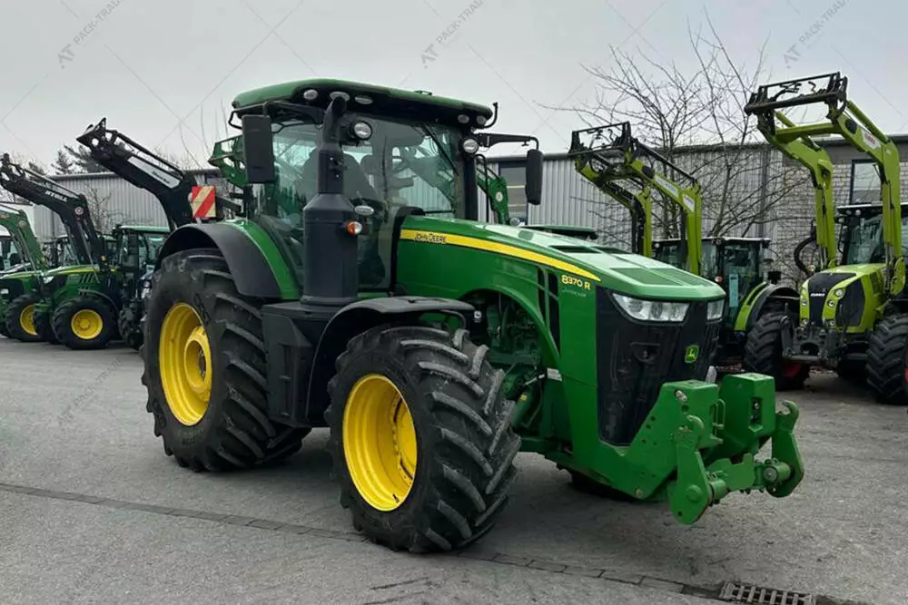 Трактор John Deere 8370R, 2017 р/в, з напрацюванням 5460 м/год. Коробка передач (E23). Передній міст ILS. 5 пар SCV, Pover Beyond, ISOBUS. ISO-джойстик, холодильник, гідравлічна центральна тяга ззаду, передня навіска, розетка ABS. Пневматичне і гідравлічне гальмо. Навіска Cat4, 1 пара гідровиходів спереду, клімат-контроль. Активації: Auto Trac, синхронізація даних (документування)