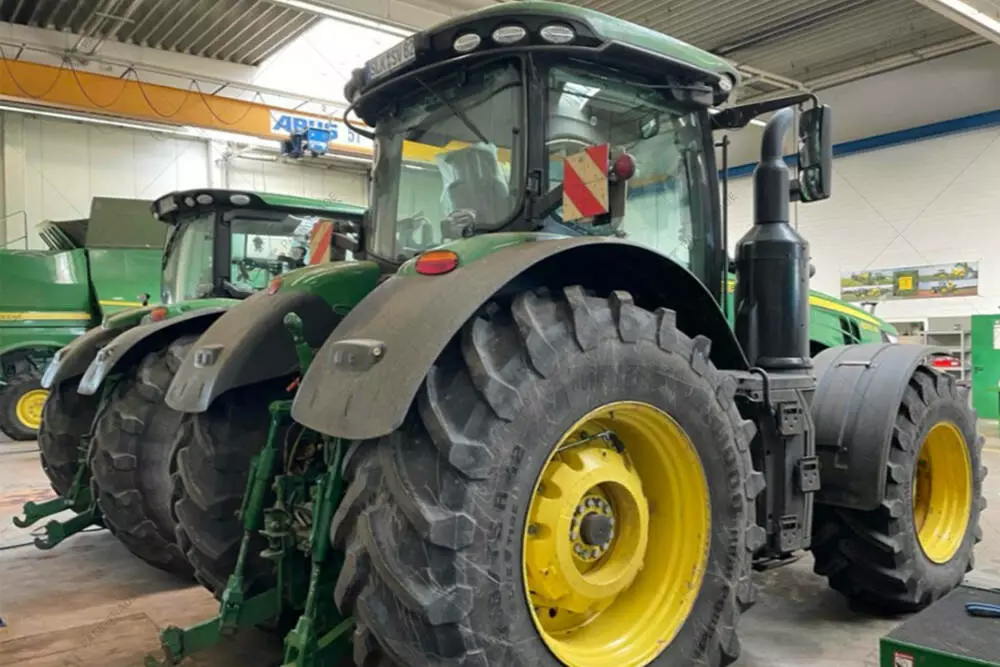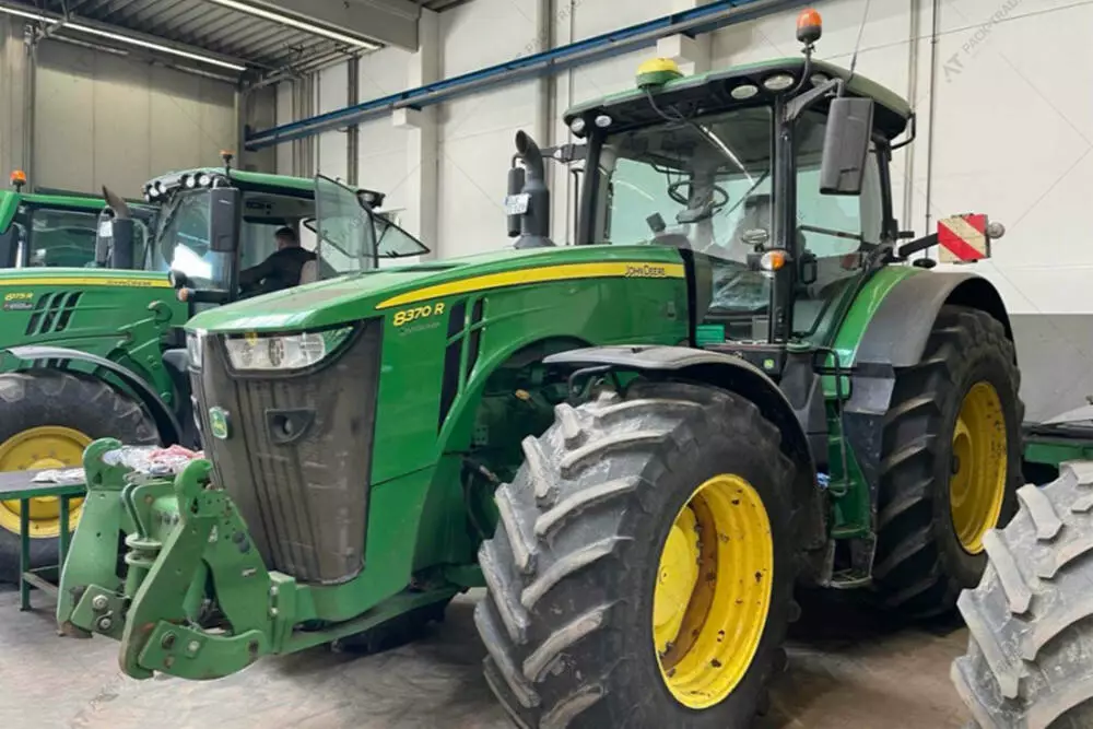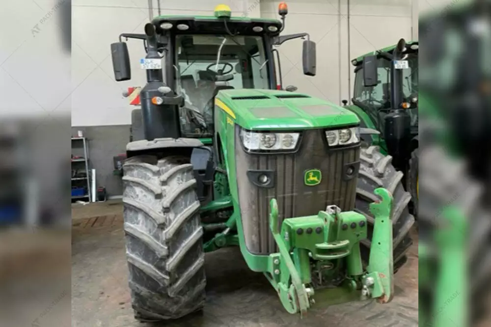 Трактор б/в John Deere 8370R, 2018 р/в, з напрацюванням – 7146 м/год. Коробка передач E23.Передній міст - ILS, холодильник, електричне регулювання дзеркал, правий двірник та шторка, 5 пар SCV, PoverBeyond, ISOBUS, задня навіска Cat4, пневматичні гальма, розетка ABS. Задні догрузи зовнішні та внутрішні. Передня гума 650/60R34 Задня гума 900/60R42, Активації - Автотрек та документування. Кліматконтроль.