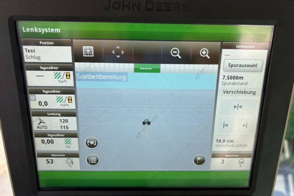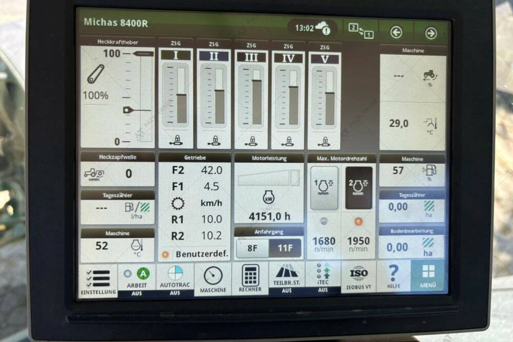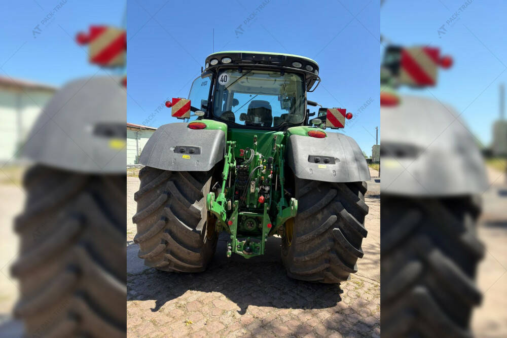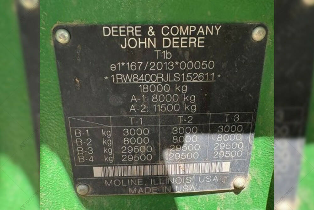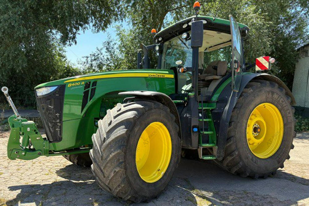 Трактор б/в John Deere 8400R, 2020 р/в, з напрацюванням — 4153 м/год. Коробка передач — E23. Передній міст — ILS. Джойстик ISOBUS, холодильник, електричне регулювання дзеркал, правий двірник та шторка, шкіряне сидіння, LED світло. 5 пар SCV, PoverBeyond, ISOBUS, задня навіска Cat4, гідравлічна центральна тяга ззаду, пневматичні гальма, розетка ABS. Передня навіска, 1 пара. Активації: Auto Trac, документування, керування секціями, спільне використання даних, автоматика розвороту. StarFire 6000GPS з RTK. Додатковий монітор. Передня гума 710/60R38 Задня гума 900/65R46.