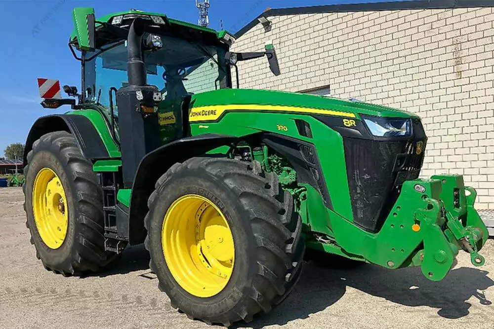 Трактор JOHN DEERE 8R370 , 2020 р/в, з напрацюванням 3376 м/год. Коробка передач IVT з джойстиком ComandPro. Салон кабіни SIGNATURE EDITION, джойстик ISOBUS, холодильник, електричне регулювання дзеркал, правий двірник та шторка, шкіряне сидіння, електричне регулювання положенням сидіння, підігрів сидіння, LED світло, світло для обслуговування з усіх боків трактора.