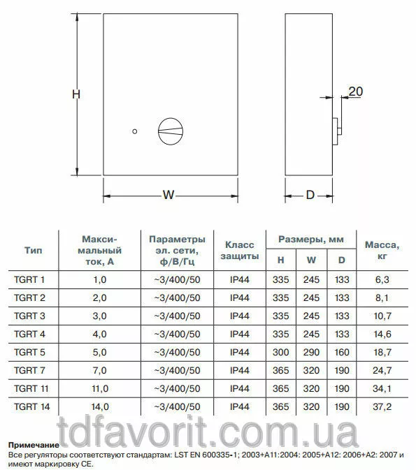 Корпус регулятора изготовлен из негорючего термопластика (TGRT1 – 4) и окрашенной стали (TGRT 5 – 14).