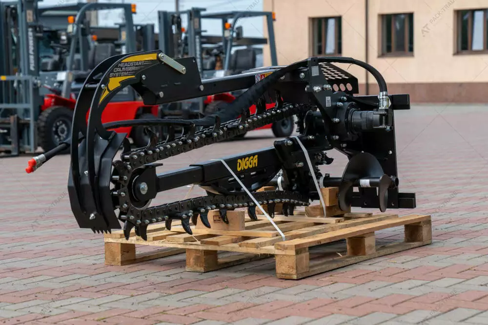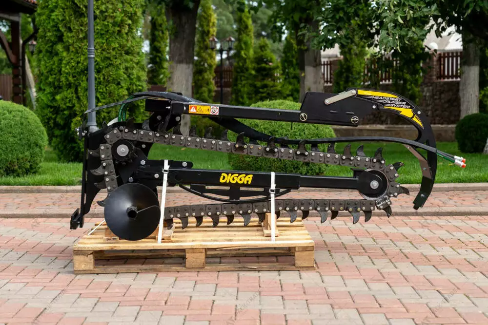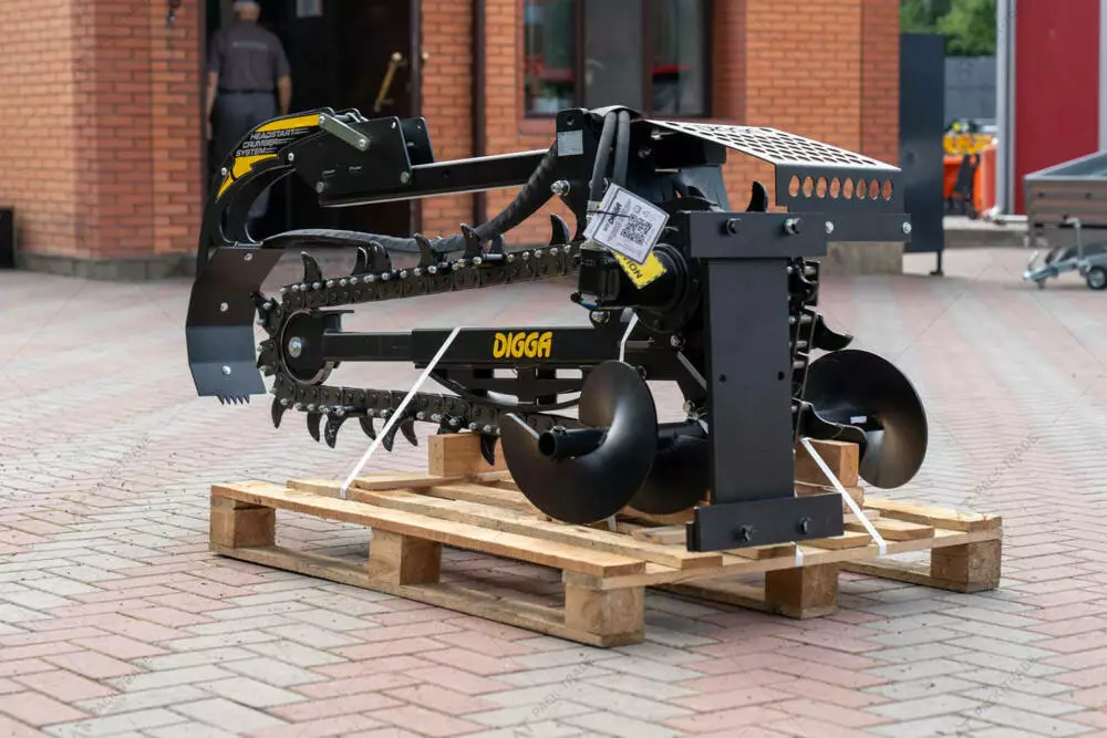 Траншеєкопач Digga HYDRIVE 1200. Стандартні моделі з глибиною копання до 1200 мм ідеально підходить для навантажувачів з бортовим поворотом, тракторів і гусеничних навантажувачів вагою до 3,5 тонн. Траншеєкопачі Digga HYDRIVE використовуються для прокладання труб, для зрошення, підземної енергетики та комунікацій, ремонту доріг, загального будівництва.