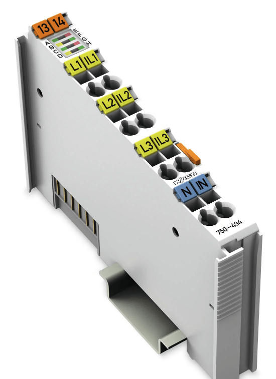 Трифазний модуль виміру потужності 750-494 призначений для виміру електричних дані в трифазній мережі живлення. Напруга вимірюється через мережеве з'єднання з L1, L2, L3 і N. Струм фаз подається на IL1, IL2, IL3 і IN через трансформатори струму. Цей модуль передає метрики безпосередньо в образ процесу, при цьому висока обчислювальна потужність від контроллера не потрібно.