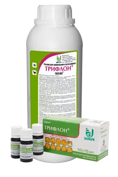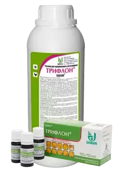 1 мл препарата содержит действующие вещества: энрофлоксацин - 100 мг, триметоприм - 50 мг, вода дистиллированная - до 1 мл. Фармакологическое действие Энрофлоксацин – антибиотик широкого спектра действия из группы фторхинолонов. Препарат имеет противомикробное действие относительно грамм-положительных и грамм-отрицательных микроорганизмов (Staphylococcus spp., Streptococcus spp., Clostridium spp., Listeria monocytogenes, Corinebacterium spp., Pseudomonas, E. coli, Haemophilus spp., Salmonella spp., Klebsiella spp., Proteus spp., Pasteurella spp. и прочие), а также действует на микоплазмы и хламидии. Механизм действия связан с угнетением бактериальной ДНК-гиразы, что приводит к нарушению репликации ДНК бактерий. Препарат хорошо и быстро всасывается из желудочно-кишечного тракта и распределяется в органах и тканях. Терапевтические концентрации достигаются через 1-1,5 часа после введения и сохраняются 24 часа. Триметоприм – противомикробное средство широкого спектра действия из группы диаминопиримидинов. Препарат имеет противомикробное действие относительно грамм-положительных и грамм-отрицательных микроорганизмов (E. coli, Klebsiella spp., Salmonella spp.; Pasteurella spp.; Enterobacter spp., Proteus spp.; Shigella spp.; Staphylococcus spp.; Streptococcus spp.; Haemophilus spp.; Chlamidia), а также действует на токсоплазмы и кокцидии. Механизм действия связан с угнетением бактериальной редуктазы дигидрофолиевой кислоты. Метаболизируется в печени и выделяется, главным образом, почками путем клубочковой фильтрации и активной канальцевой секреции. Концентрация в моче значительно выше, чем в крови. Период полувыведения составляет 8 - 10 часов. Применение Препарат Трифлон применяют для лечения инфекционных заболеваний птицы, обусловленных бактериальной микрофлорой, чувствительной к энрофлоксацину и триметоприму: колиинфекция, сальмонеллез, некротический энтерит, стрептококкоз, гемофилез, микоплазмоз и прочие. Дозирование Куры: перорально с питьевой водой в дозе 0,5-1 мл на 1 л питьевой воды на протяжении 3-5 суток.
