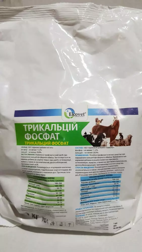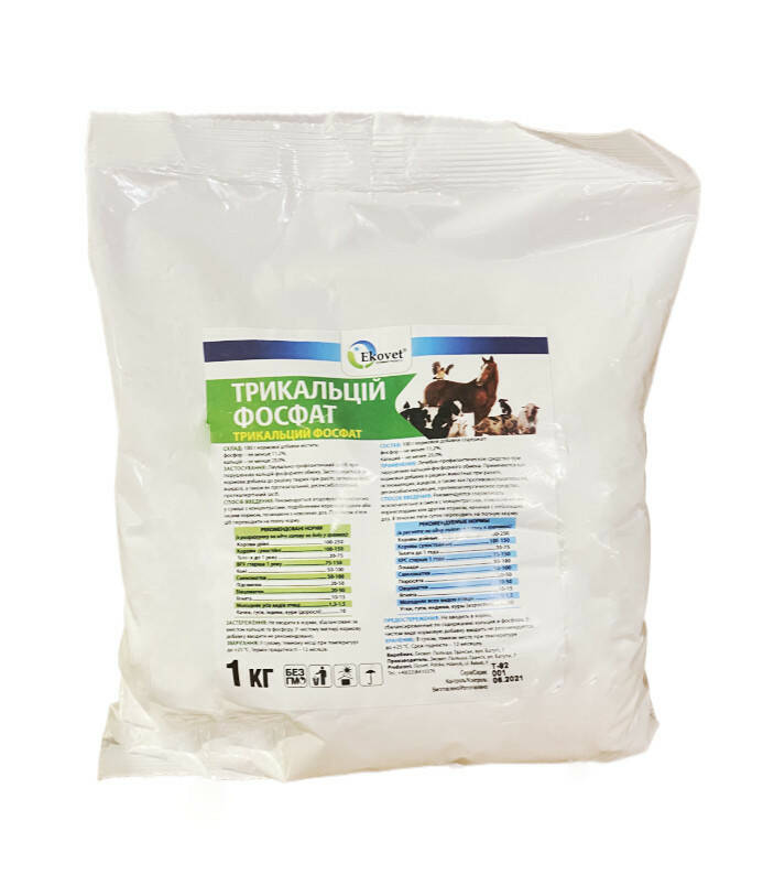 Трикальцій фосфат 1 кг - лікувально-профілактичний засіб при порушення кальцій-фосфорного обміну. Застосовується як кормова добавка в раціон тварин при рахіті, остеомаляції, ацидозі, а також як протизапальний, десенсибілізуючий, протиалергічний засіб.