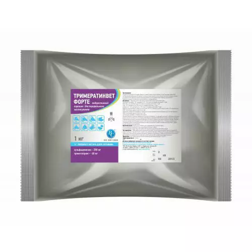 Тримератинвет Форте порошок - комбінований препарат, до складу якого входять сульфадимидин і триметоприм. Ефективність препарату обумовлена ​​дією вищевказаних компонентів, які в поєднанні проявляють синергічну дію, в результаті чого активність препарату значно вище, ніж активність окремо взятих компонентів.