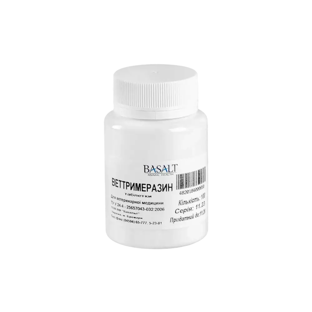 таблетка округлої пласкої форми від білого до світло-жовтого кольору. Склад: до складу однієї таблетки входять: сульфадимезин (400 мг), триметоприм (80 мг), формоутворюючі речовини. Фармакологічні властивості: комбінована дія складових препарату призводить до гальмування росту і розвитку мікробної клітини. Препарат має широкий спектр антимікробної дії та ефективний по відношенню до грампозитивних та грамнегативних мікроорганізмів: Salmonella, Е. соli, Staphylococcus, Pasteurella spp., Streptococcus, Mycoplasma та інші. Показання та дозування: Лікування захворювань шлунково-кишкового тракту, органів дихання, сечостатевої системи бактеріальної етіології, ускладнень при вірусних захворюваннях у телят, поросят, ягнят, лошат, овець і свиней. Задають перорально з водою чи молоком або з кормом в дозі ½ таблетки двічі – через кожні 12 годин. Лікування продовжують до повного зникнення симптомів захворювання і наступні 2 дні. Протипоказання: підвищена чутливість до сульфаніламідів. Не застосовувати одночасно з препаратами, що містять у своєму складі параамінобензойну кислоту. Застереження: забій тварин на м'ясо дозволяється не раніше ніж через 15 діб після останнього застосування препарату. До зазначеного терміну м'ясо згодовують непродуктивним тваринам або утилізують (залежно від висновку ветлікаря). Форма випуску: полімерні банки по 50, 100, 300 шт. Умови зберігання: у сухому темному місці при температурі від 0°С до +18°С. Термін придатності: 3 роки.