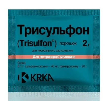 У 100 г трисульфона міститься: сульфамонометоксін – 4 г і триметоприм – 2 р. За зовнішнім виглядом являє собою білий сипучий порошок без запаху. Пакети з ламінованої фольги по 1 кг.