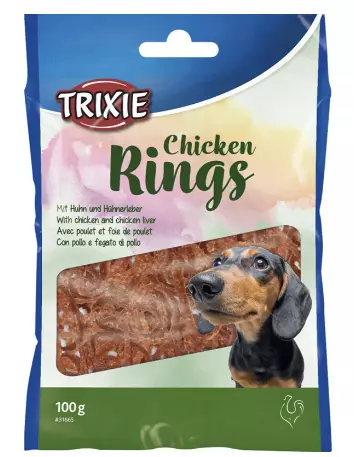 Trixie Chicken Rings - дуже смачні ласощі для собак, зроблені у формі кілець, у складі яких куряче м'ясо та печінка. Ароматні кільця обов'язково сподобаються Вашому вихованцю, особливо як заохочення під час ігор або тренувань.