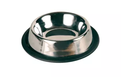 Хромована металева миска дуже стійка, не їздить по підлозі завдяки гумовому кільцю по основі.