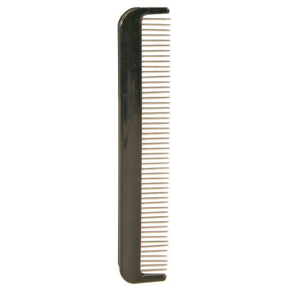 Пластикова гребінець класичної форми для регулярного догляду за шерстю собак. Підходить для всіх типів шерсті, крім дуже жорсткої та густої, яка потребує регулярного триммингу. Зубчики круглі, обертаються, тому легко можна розплутати скомкавшуюся і злежався шерсть, запобігаючи появу ковтунів. Закруглені кінчики зубчиків масажують шкірні покриви, стимулюючи приплив крові. Це забезпечує волосяні цибулини поживними речовинами і киснем. Метал не викликає алергічних реакцій і не схильний до корозії при попаданні вологи. При регулярному, щоденному використанні гребінці для собаки ви легко приведете її шерсть у здоровий стан.