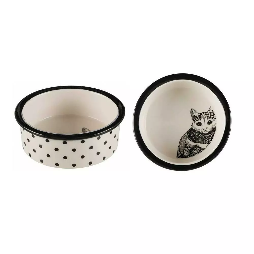 Матеріал: кераміка. Об'єм: 0,3 л. Діаметр: 12 см Миски Тгіхіе виготовлені з металу високої якості, а тому вироби дуже міцні. Велику вагу мисок допомагає їм залишатися нерухомими: при годуванні кішки вони не перекинуться і не будуть переміщатися по всій кухні. Миски для годування Тгіхіе з кераміки добре миються, навіть засохлі частинки корму відмиваються без зайвих проблем. Можна мити в посудомийній машині.