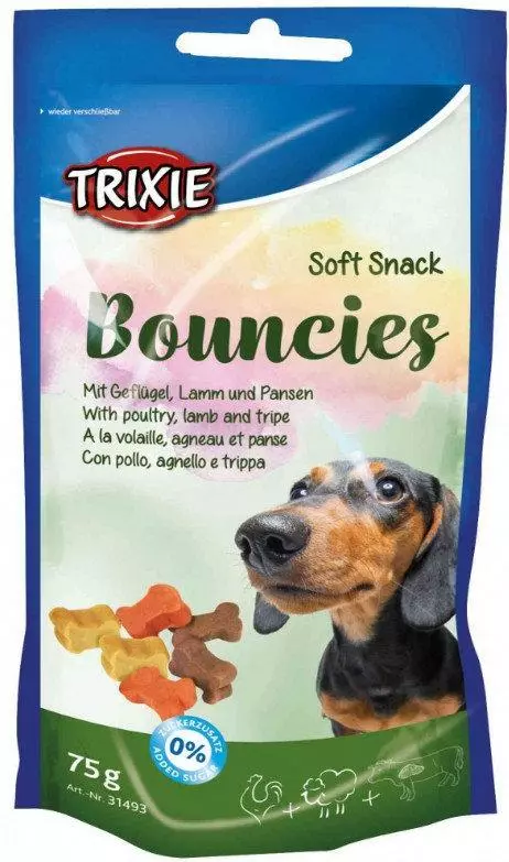 Trixie Bouncies - ласощі чудово допомагають тварині утримувати порожнину рота в ідеальному стані. Абсолютно вся продукція компанія випускається із сертифікатами якості та не містить у своєму складі шкідливих компонентів, тому є абсолютно безпечною продукцією для цуценят, що потребують якісного прикорму. За допомогою Soft Snack Bouncies, у них освіжається дихання, а також відбувається очищення і догляд за ротовою порожниною.