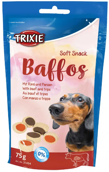 Ласощі Trixie Soft Snack Baffos — відмінне частування для собак. Ласощі не містить барвників та консервантів, не шкодить порожнини пащі собаки.