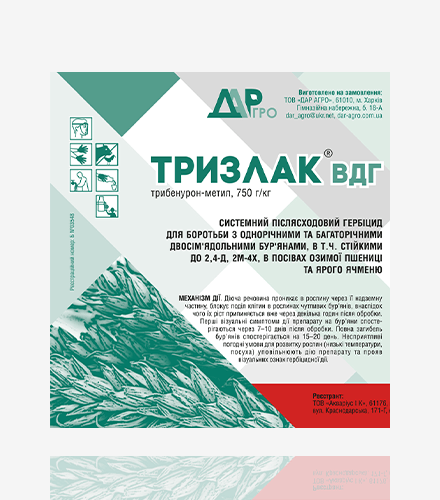 Назва товару: Тризлак Короткий опис: Тризлак — це системний гербіцид, призначений для післясходової боротьби з однорічними та багаторічними дводольними бур'янами в посівах озимої пшениці та ярого ячменю, включаючи види, стійкі до деяких інших гербіцидів. Механізм дії: Тризлак швидко проникає в бур'яни через листя та коріння, переміщуючись до точок росту. Він блокує розподіл клітин, зупиняючи розвиток і зростання бур'янів. Перші ознаки гербіцидної дії виникають через 5-8 днів, а повна загибель настає за 15-21 день. Переваги: - Ефективний проти широкого спектра однорічних та багаторічних дводольних бур'янів; - Низька норма внесення, що забезпечує зручність у використанні; - Гнучкі терміни застосування, відповідні для різних стадій розвитку культур; - Висока сумісність з більшістю пестицидів; - Не має обмежень у сівозміні. Особливості застосування: - Тризлак застосовують у фазі розвитку культури від 2-3 листків до виходу в трубку ячменю та до прапорцевого листка у пшениці озимої. - Для однорічних бур'янів найкраща ефективність спостерігається у фазі 2-4 листки, для багаторічних — у період активного росту. - Робочий розчин слід використовувати впродовж 24 годин після приготування, у суху погоду для забезпечення оптимальної ефективності.