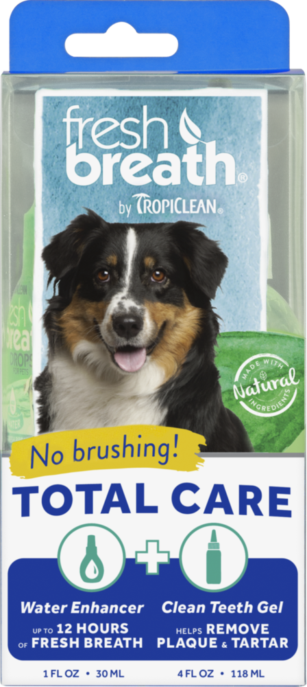 Набір TropiClean Total Care Kit - це комплексне рішення для догляду за порожниною рота: здоров'я зубів, ясен і свіжого дихання. Набір включає: гель для догляду за порожниною рота «Без чистки» і добавка в воду «дропсами» Унікальна суміш інгредієнтів гелю для догляду за порожниною рота допомагає видалити наліт і запобігти утворенню зубного каменю, а унікальна формула добавки у воду забезпечує свіжий подих в 12:00. В комплект входять: м'ятний гель TropiClean Fresh Breath 118мл, Склад: вода очищена, природні похідні спирту, гліцерин, м'ята, природний очисник, карбомер, хлорофіл, екстракт листя зеленого чаю Добавка Дропси у воду 30 мл,Просто додайте 3 краплі на 500 мл води, до 12 годин свіжого дихання.Склад : вода очищена, гліцерин, цетилпиридиний хлорид, сорбат калію, лимонна кислота, екстракт листя зеленого чаю, хлорофіл. Чисті зуби, здорові ясна, щасливий улюбленець!