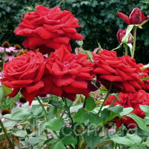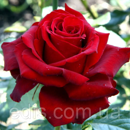 Саджанці чайно-гібридних троянд Бургунд (Burgund) Дуже популярний срезочный сорт, чудово переносить примхи погоди. Квітки великі, бокалоподібної форми, темно-бордові, оксамитові, з легким ароматом. Листя великі, темно-зелені. Густий кущ, прямо рослий, заввишки 80-100 див. Цвітіння рясне, починається з кінця червня і триває до самих заморозків. Роза невибаглива, відмінно підходить для прикраси присадибних ділянок. Під час росту куща потрібно проводити регулярні підгодівлі і обробки від шкідників і хвороб.