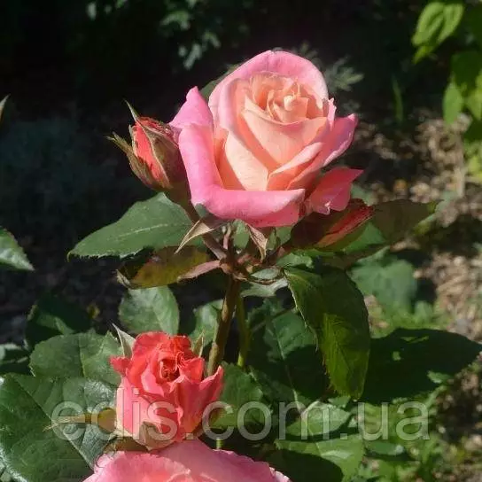 Один із самих нових сортів. Офіційно Єва віднесена до групи чайно-гібридних завдяки класичній формі бутона з високим центром, але насправді цей сорт є універсальним. Кущ самостійно добре галузиться, рідко утворюється один бутон, частіше – кисть з 3-х бутонів. Молоді пагони червонуваті, листя велика, темно-зелена.