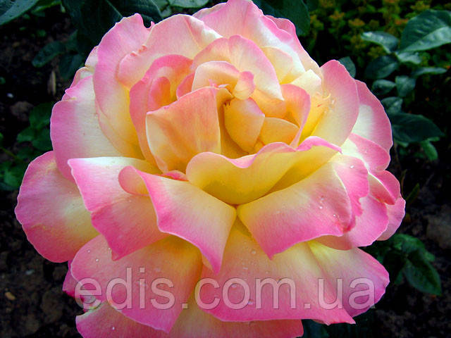 Саджанці чайно-гібридних троянд Глорія Дей (Gloria Dei) Цей самий сорт стійкий до морозів і хвороб. Легендарна Глорія Дей вважається самою прекрасною трояндою серед чайно-гібридних. Сорт даної троянди з ніжними лимонно-жовтими квітками з рожевим напиленням і тонким ароматом. Келихоподібна великий бутон при розпусканні спочатку стає зеленувато-жовтим, потім забарвлюються в золотисто-жовті тони з легким рожевим відтінком, при розпусканні краї пелюсток набувають інтенсивно-рожевого забарвлення. Її квітки густомахрові, іноді з 45 і більше пелюстками! Діаметр квіток до 15 -17 див. Роза безперервно цвіте протягом усього літа. Останні квітки з'являються в самому кінці осені. Середня висота куща — 1 м, прямостоячі пагони мають темно-зелені шкірясті, глянцеві листя. Сорт вважається морозостійким.