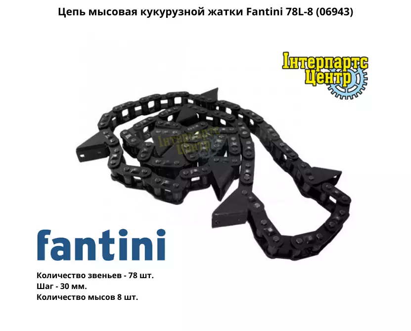 Транспортерний ланцюг (мисовий ланцюг) на кукурудзяні жниварки Fantini. Кількість ланок – 78 шт. Крок – 30 мм. Кількість мисів 8 шт. Ланцюг мисовий кукурудзяної жниварки Fantini. Ланцюг роликовий втягуючого транспортера застосовується для захоплення стебел кукурудзи та направлення їх у бік вузла качановідділювача жниварки.