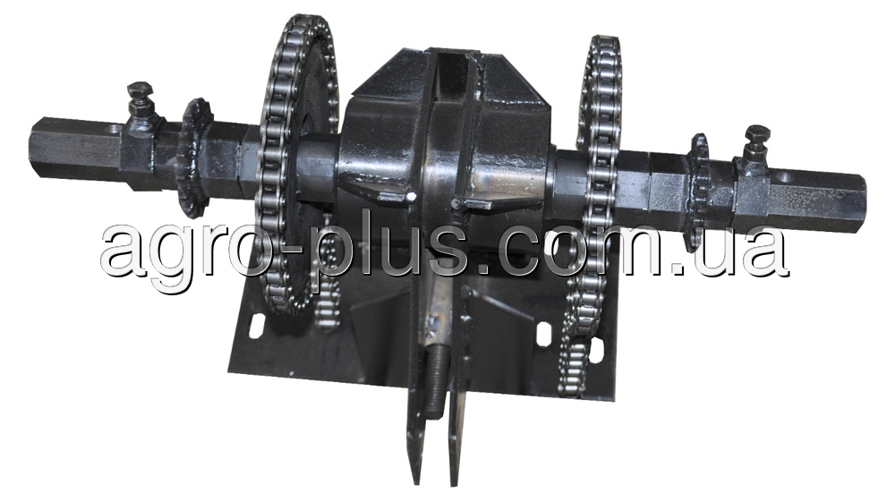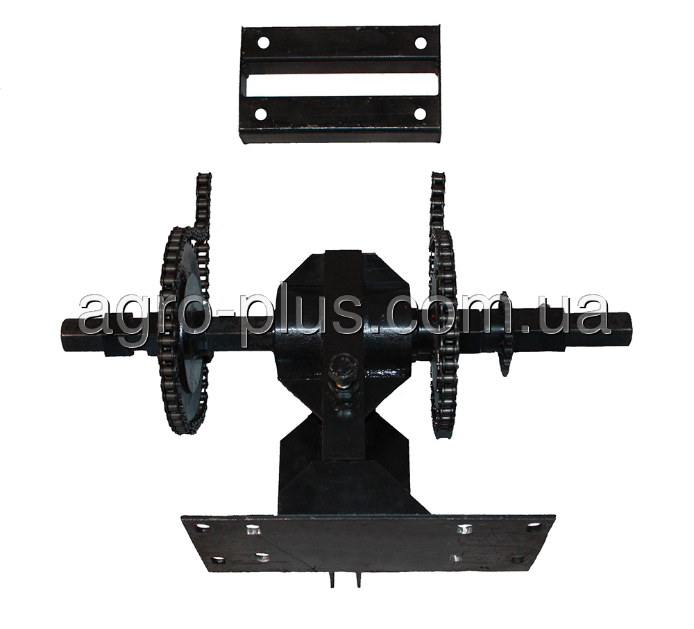 В комплекте: корпус с запрессованным шестигранным валом, переходная рамка из профильной трубы, для крепления к бензиновой версии мотоблока "Zirka-105" , большие звёзды — 2 шт., малые звёзды — 2 шт., цепь — 2 шт., хомут для фиксации звёзд на шестигранном валу 2 шт.