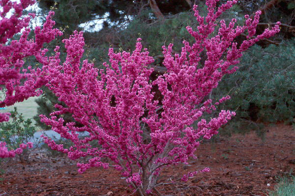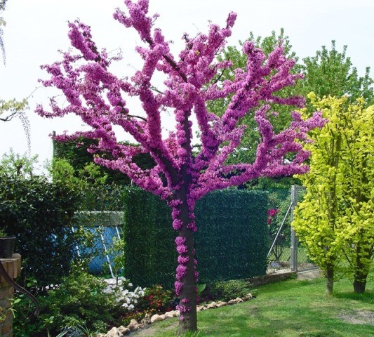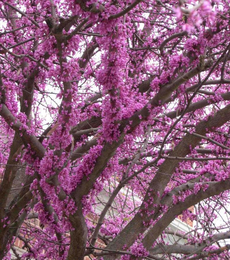 Цвітіння. Дуже декоративний під час цвітіння за рахунок пурпурно-рожевих квітів, які рясно покривають стовбур і гілки ще до розпускання листя - рідкісна вражаюча властивість для рослин наших широт. Плоди боби залишаються на кущах навіть взимку. .