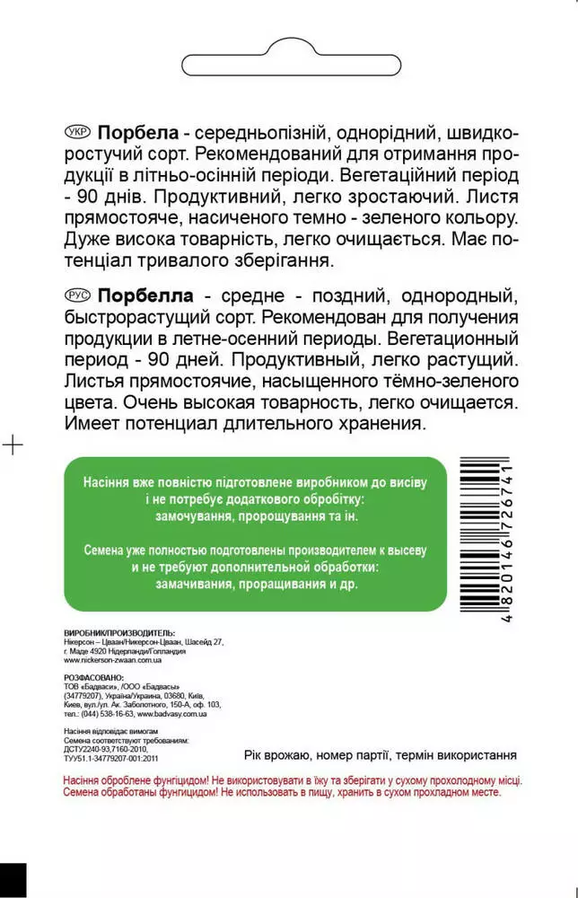 пізній, однорідний, швидкоростучий сорт. Рекомендований для отримання продукції в літньо-осінній періоди. Вегетаційний період - 90 днів. Продуктивний, легко зростаючий. Листя прямостояче, насиченого темно - зеленого кольору. Дуже висока товарність, легко очищається. Має потенціал тривалого зберігання.