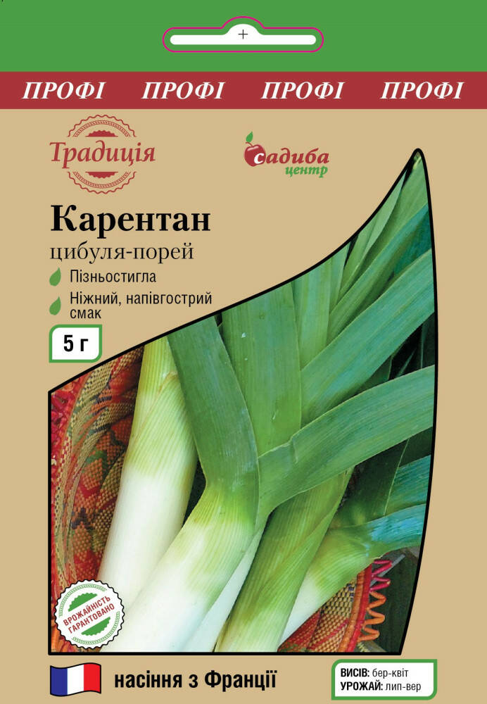 Карентан - пізньостиглий сорт цибулі порей з напівгострим смаком. Листя плескате, темно - зеленого кольору. Великі, довгі, білі стебла довжиною 18 - 22 см та шириною 4 - 6 см. Дуже простий у вирощуванні та продуктивний сорт. Можливе тривале зберігання у вертикальному положенні присипавши піском. Для споживання у свіжому вигляді та кулінарії.