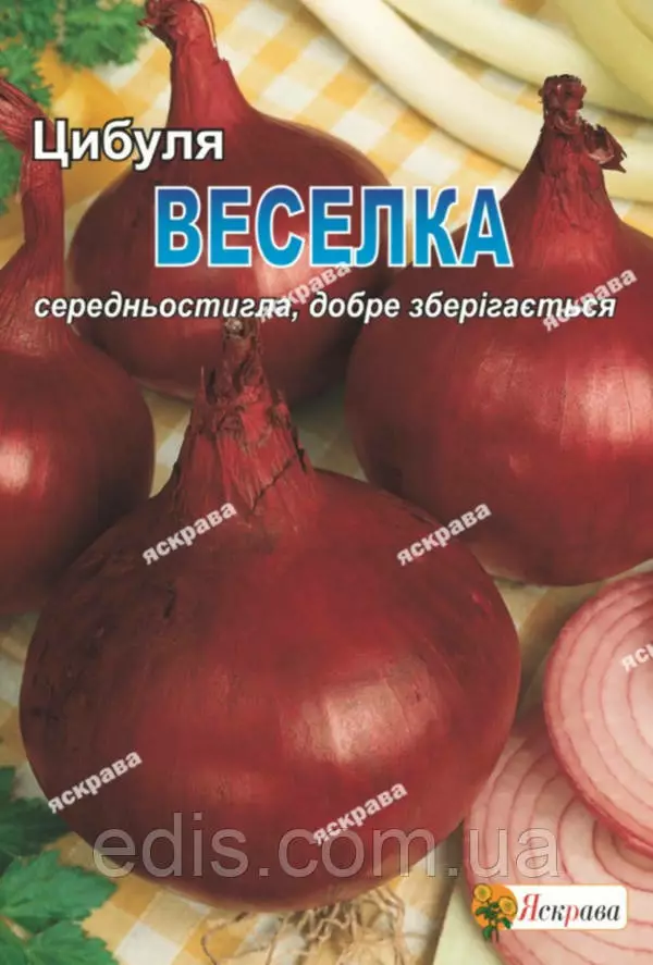 Цибуля Веселка (червоний) 8 г Середній сорт. Вегетаційний період від сходів до масового вилягання листя 92-115 днів. Цибулина округла, велика, масою до 250 г, напівгострого смаку. Забарвлення луски червоно-фіолетового кольору. Яскраво червоні кільця цього сорту є відмінною прикрасою будь-якого кулінарного блюда. Рекомендований для вирощування в однорічній культурі з насіння.