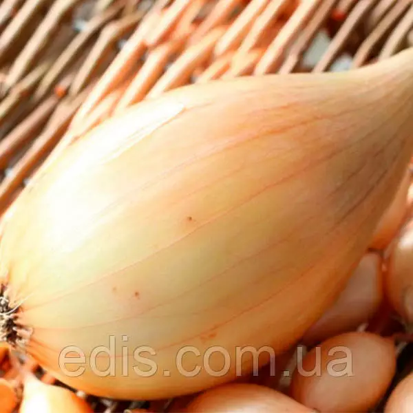 плод — вытянутой или грушевидной формы луковица до 10 см в длину, покрыта светло-коричневого цвета плотной шелухой, средняя масса — 80-100 г, мякоть — сочная, ароматная, слабо-острого вкуса, почти сладкая