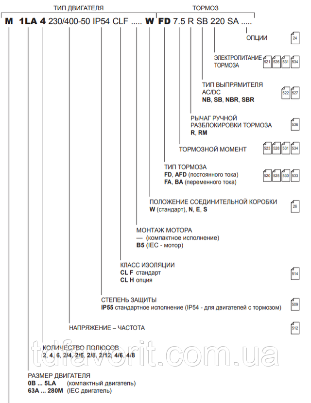 AL, AR - Антиреверсний пристрій — стопор зворотного ходу (тільки для електродвигунів серії M). Забезпечує обертання тільки проти годинникової стрілки для редукторів з 2 і 4 ступенями редукції й обертання за годинниковою стрілкою для редукторів із 3 ступенями редукції (від боку вихідного вала редуктора).