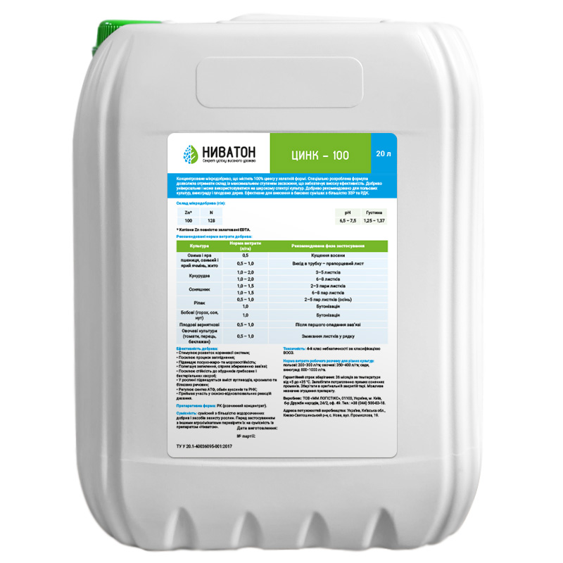 склад із максимальним ступенем засвоєння, що забезпечує високу ефективність. Хелатуючим агентом у добриві є ЕДТА. Застосування добрива Ниватон Цинк 100 дозволяє швидко нейтралізувати тимчасовий дефіцит цинку й забезпечити його ефективну профілактику. Добриво рекомендовано для польових культур, винограду і плодових дерев. Ефективне для внесення в бакових сумішах з більшістю ЗЗР.