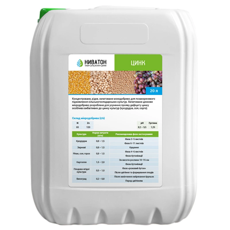 Хелатуючим агентом у добриві є лимонна кислота, а сам цинк перебуває у формі цинк-цитрату, найбільш природний для рослин. Застосування добрива Ниватон Цинк 120 дозволяє швидко нейтралізувати тимчасовий дефіцит цинку й забезпечити його ефективну профілактику. Добриво рекомендовано для польових культур, винограду та плодових дерев.