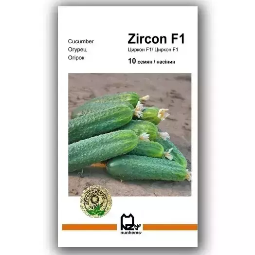 Огірок Циркон F1 - гібрид самоозапильного огірка середньраннього терміну дозрівання корнішонного типу. Довжина плодів в середньому до 9-11 см. Строк дозрівання цього сорта 45-50 днів, а вага плоду 65-85 г. Формуэ потужну рослину вегетативно-генеративного типу.  Толерантний до вірусів пожовтіння судин огірка , огіркової мозаїки та борошнистої роси. Гібрид відрізняється високою врожайністю і гнучкістю до різних умов вирощування. Циркон F1 рекомендується для вирощування у відкритому ґрунті. Оптимальна щільність рослин 35-45 тис/га. Плоди цього огірка циліндричної форми, крупногорбкуваті, однорідні, темно-зеленого кольору, з відмінними смаковими якостями. Співвідношення довжини плода до діаметру – 3,2:1. Привабливі плоди використовують для свіжого ринку та переробки. Вони зберігають необхідну щільність і залишаються хрусткими після консервування.
