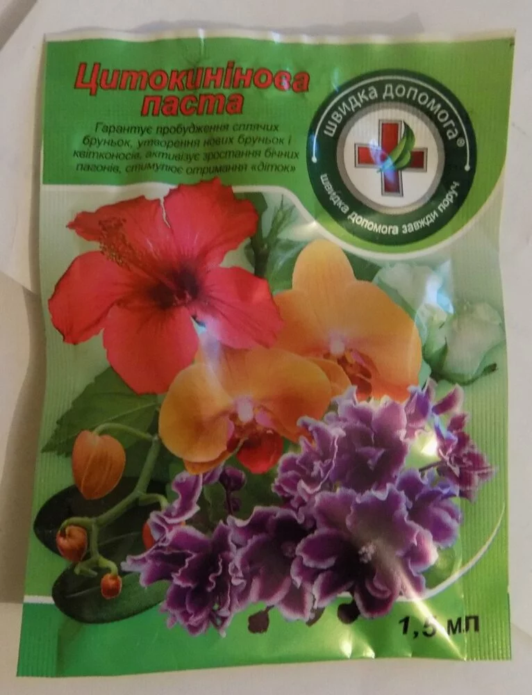 Предлагаем цитокининовую пасту собственного производства. Цитокининовая паста это стимулятор пробуждения спящих почек и образования новых с последующим прорастанием цветоноса и «деток» на 7-14 день. Действие цитокининовой пасты основано на способности препарата вызывать массовое деление клеток растения. Применяется в садоводстве и комнатном цветоводстве, для стимулирования зарождения, развития и роста почек, хорошо зарекомендовала себя в работе как с обычными садово-плодовыми культурами, так и с редкими, сложными в уходе растениями. В комнатном цветоводстве применяется для стимулирования к цветению и размножению путем образования «дeток». Видовых ограничений в применении препарата нет. Эффективно реагируют на препарат все виды и сорта орхидей, сенполий, суккулентов, гибискусов, роз, камелий, цитрусовых и др. Способ применения и рекомендации. Пробуждение почки: Острой дезинфицированной иглой царапнуть живую клеточную ткань почки. В случае необходимости предварительно осторожно снять защищающие сухие чешуйки. На место расцарапывания наложить пасту размером с горошину диаметром 1,5-2,5 мм и покрыть почку тонким слоем. Пробуждение почки начнется в зависимости от вида растения на 7-10-й день. Метод отлично работает на розах, фаленопсисах, бегониях, диффенбахиях, толстянках, цитрусовых и мн. др. Применяя этот метод можно правильно сформировать крону растения. Количество искусственно пробужденных почек должно быть минимальным (1-3 почки), но в целом зависит от способности корневой системы обеспечить питанием новые побеги. Чрезмерное количество препарата может вызвать пробуждение сразу нескольких побегов из одной почки, что также не желательно. такие побеги зачастую не могут полностью развиться. Заметив новый рост, следует помнить, что растение в этот момент нуждается в соответствующей подкормке и условиях (теплое и светлое месторасположение). Если же вокруг растения «зимние» условия, то вынужденный рост может привести к истощению растения и ухудшению его внешнего вида. Наилучшее время применения — период роста или непосредственно перед ним. Также следует знать, что для зарождения цветоноса на почку необходимо наносить минимальный слой пасты. для зарождения «детки» немного больше. Компания «ОВИ» реализует Цитокининовую пасту собственного производства. Цитокининовую пасту поставляется в виде желтой пасты, упакованной в мини-пробирочки. Срок годности 3 года.