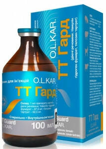 ТТ Гард (розчин для ін'єкцій) Опис Прозорий розчин жовтуватого кольору. Склад 1 мл препарату містить діючі речовини: тіамулін гідроген фумарат - 87,5 мг; тилозин тартрат - 62,5 мг. Фармакологічні властивості Поєднання у складі препарату тіамуліну та тилозину у певному співвідношенні забезпечує широкий спектр активності проти більшості бактерій, мікоплазм, рикетсій, спірохет, трепонем, хламідій, що є основними збудниками захворювань сільськогосподарських тварин. Тіамулін - напівсинтетичний антибіотик групи плевромуліну, що гальмує синтез білка у чутливих до нього мікроорганізмів. Тіамулін діє бактеріостатично щодо грампозитивних (Erysipelothrix spp., Staphylococcus spp., Streptococcus spp., Listeria monocytogenes, Corynebacterium pyogenes) і грамнегативних бактерій (Pasteurella spp., Klebsiella pneumoniae, Campylobacter coli, Lawsonia intracellularis, Fusobacterium necrophorum); мікоплазм (Mycoplasma bovis, M. hyopneumoniae, M. hyorhinis, M. synoviae, M. hyosynoviae тощо); лептоспір (Leptospira spp.); спірохет (Serpulina hyodysenteria, S. innocens); трепонем (Treponema hyodysenteriae) та хламідій (Chlamydia spp.). Тилозин - антибіотик із групи макролідів. Його бактеріостатична дія базується на пригніченні бактеріального синтезу протеїнів внаслідок зв'язування з рибосомами. Тилозин активний проти грампозитивних (Actinomycеs spp., Bacillus anthracis, Clostridium spp., Corynebacterium spp., Streptococcus spp., E. colli, Erysipelothrix rhusiopathiae) і грамнегативних бактерій (Brucella spp., Fusobacterium spp., Haemophilus spp., Pasteurella spp., Salmonella spp., Treponema spp., Bordetella bronchiseptica, Proteus mirabilis тощо) та пригнічує розвиток деяких штамів Mycoplasma spp., Chlamydia spp., Ureаplasma spp. і Rikettsia spp. Застосування Свині: лікування тварин, хворих на бешиху, дизентерію, ілеїт, лептоспіроз, лістеріоз, кампілобактеріоз, колібактеріоз, пастерельоз, сальмонельоз, інфекційний гастроентерит, спірохетний ентероколіт, атрофічний риніт, ензоотичну пневмонію, актинобацилярну плевропневмонію та мікоплазматичний артрит, що спричинені мікроорганізмами, чутливими до тіамуліну та тилозину. Велика рогата худоба, вівці та кози: лікування тварин, хворих на бронхопневмонію, дизентерію, перитоніт, метрит, пупочний сепсис, гнійний артрит, копитну гниль, бруцельоз, лептоспіроз, післяпологові ускладнення та хірургічні інфекції, що спричинені мікроорганізмами, чутливими до тіамуліну та тилозину. Дозування Внутрішньом'язово у дозі 1 мл на 10 кг маси тіла один раз на добу протягом 3-5 діб. При ензоотичній пневмонії, мікоплазматичному артриті у свиней вказану дозу збільшують на 25-50%. Перед введенням препарат необхідно підігріти до температури 25-30 °С. Через 7-10 діб після лікування препаратом свиней, хворих на дизентерію чи ілеїт, доцільно повторити обробку цим же препаратом або іншими антимікробними засобами для перорального застосування на основі тилозину або тіамуліну у профілактичних дозах згідно їх настанов. Протипоказання Підвищена індивідуальна чутливість до тилозину та тіамуліну. Не застосовувати свиноматкам в перший місяць після осіменіння. Свиням не застосовувати засоби, які містять монензин, наразин чи саліноміцин щонайменше протягом 7 діб до та після лікування тіамуліном. Не застосовувати одночасно з пеніцилінами, цефалоспоринами та лінкоміцином. Застереження Забій тварин на м'ясо дозволяється через 10 діб, використання молока для харчування людей - через 5 діб після останнього застосування препарату. Отримане до зазначеного терміну м'ясо та молоко утилізують або згодовують непродуктивним тваринам, залежно від висновку лікаря ветеринарної