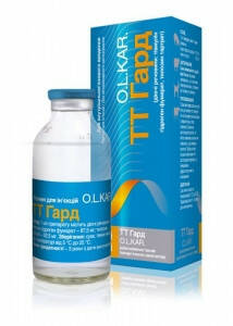 ТТ Гард (розчин для ін'єкцій) Опис Прозорий розчин жовтуватого кольору. Склад 1 мл препарату містить діючі речовини: тіамулін гідроген фумарат - 87,5 мг; тилозин тартрат - 62,5 мг. Фармакологічні властивості Поєднання у складі препарату тіамуліну та тилозину у певному співвідношенні забезпечує широкий спектр активності проти більшості бактерій, мікоплазм, рикетсій, спірохет, трепонем, хламідій, що є основними збудниками захворювань сільськогосподарських тварин. Тіамулін - напівсинтетичний антибіотик групи плевромуліну, що гальмує синтез білка у чутливих до нього мікроорганізмів. Тіамулін діє бактеріостатично щодо грампозитивних (Erysipelothrix spp., Staphylococcus spp., Streptococcus spp., Listeria monocytogenes, Corynebacterium pyogenes) і грамнегативних бактерій (Pasteurella spp., Klebsiella pneumoniae, Campylobacter coli, Lawsonia intracellularis, Fusobacterium necrophorum); мікоплазм (Mycoplasma bovis, M. hyopneumoniae, M. hyorhinis, M. synoviae, M. hyosynoviae тощо); лептоспір (Leptospira spp.); спірохет (Serpulina hyodysenteria, S. innocens); трепонем (Treponema hyodysenteriae) та хламідій (Chlamydia spp.). Тилозин - антибіотик із групи макролідів. Його бактеріостатична дія базується на пригніченні бактеріального синтезу протеїнів внаслідок зв'язування з рибосомами. Тилозин активний проти грампозитивних (Actinomycеs spp., Bacillus anthracis, Clostridium spp., Corynebacterium spp., Streptococcus spp., E. colli, Erysipelothrix rhusiopathiae) і грамнегативних бактерій (Brucella spp., Fusobacterium spp., Haemophilus spp., Pasteurella spp., Salmonella spp., Treponema spp., Bordetella bronchiseptica, Proteus mirabilis тощо) та пригнічує розвиток деяких штамів Mycoplasma spp., Chlamydia spp., Ureаplasma spp. і Rikettsia spp. Застосування Свині: лікування тварин, хворих на бешиху, дизентерію, ілеїт, лептоспіроз, лістеріоз, кампілобактеріоз, колібактеріоз, пастерельоз, сальмонельоз, інфекційний гастроентерит, спірохетний ентероколіт, атрофічний риніт, ензоотичну пневмонію, актинобацилярну плевропневмонію та мікоплазматичний артрит, що спричинені мікроорганізмами, чутливими до тіамуліну та тилозину. Велика рогата худоба, вівці та кози: лікування тварин, хворих на бронхопневмонію, дизентерію, перитоніт, метрит, пупочний сепсис, гнійний артрит, копитну гниль, бруцельоз, лептоспіроз, післяпологові ускладнення та хірургічні інфекції, що спричинені мікроорганізмами, чутливими до тіамуліну та тилозину. Дозування Внутрішньом'язово у дозі 1 мл на 10 кг маси тіла один раз на добу протягом 3-5 діб. При ензоотичній пневмонії, мікоплазматичному артриті у свиней вказану дозу збільшують на 25-50%. Перед введенням препарат необхідно підігріти до температури 25-30 °С. Через 7-10 діб після лікування препаратом свиней, хворих на дизентерію чи ілеїт, доцільно повторити обробку цим же препаратом або іншими антимікробними засобами для перорального застосування на основі тилозину або тіамуліну у профілактичних дозах згідно їх настанов. Протипоказання Підвищена індивідуальна чутливість до тилозину та тіамуліну. Не застосовувати свиноматкам в перший місяць після осіменіння. Свиням не застосовувати засоби, які містять монензин, наразин чи саліноміцин щонайменше протягом 7 діб до та після лікування тіамуліном. Не застосовувати одночасно з пеніцилінами, цефалоспоринами та лінкоміцином. Застереження Забій тварин на м'ясо дозволяється через 10 діб, використання молока для харчування людей - через 5 діб після останнього застосування препарату. Отримане до зазначеного терміну м'ясо та молоко утилізують або згодовують непродуктивним тваринам, залежно від висновку лікаря ветеринарної