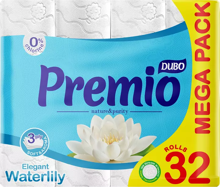 Туалетний папір Диво Premio Waterlily — це преміальний вибір для тих, хто цінує м’якість, елегантний дизайн і високу якість. Тришаровий папір із ніжним зеленим профарбуванням та тисненням у вигляді квітів лілії водяної створює відчуття свіжості та витонченості. Завдяки використанню 100% целюлози, папір має чудову міцність, м’якість і безпечний навіть для чутливої шкіри. Велика упаковка з 32 рулонів забезпечує економічність і зручність у користуванні.